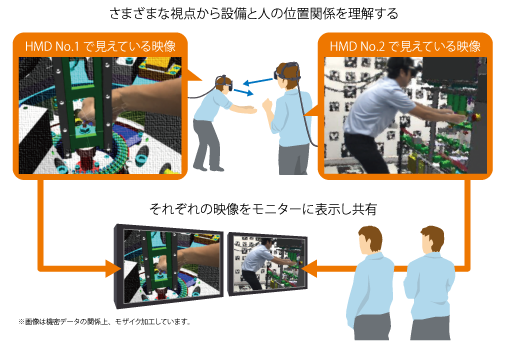 ヘッドマウントディスプレイ(HMD)のカメラで自分の手や周囲のリアルな風景を取り込み、これにヴァーチャルな設備画像をリアルタイムに合成。