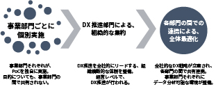 最終的には、各事業部門にデータサイエンティストのようなDX人材を配置し、DX推進部門が中心となって、それら各事業部門のDX人材へ教育やツール、事例共有などを進め難易度の高いテーマに絞ってDX推進部門が主体的に関与することで、企業全体のDX推進を推し進めていける体制が理想的な組織と言えます。しかし、十分な人的リソースもノウハウもない現状では、DX推進部門側で知見を蓄えていきながら、事業部門とともにデータ活用を推進し、成功体験を積み上げていくことが重要です。