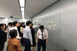 今回の技術活用研究会で、まずアジャイル開発に対してどんなことを知りたいと思っているのかを参加者全員で共有しました。その後“アジャイルで知りたいこと”を付箋紙に記述し壁に貼り、各人にラベルシールを配布し、共感する付箋に貼っていただきました。