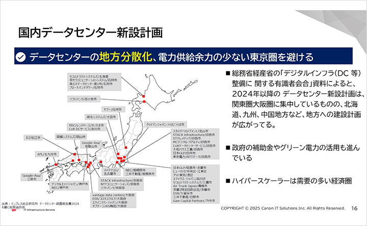 生成AIの普及に伴い、データセンターの高負荷化が進む中、液冷方式による冷却技術が注目されています。本セッションでは、当社が提供する液冷方式のサーバー冷却サービスの実例と、導入に至るまでの課題・解決策を紹介します。はじめに、キヤノンITソリューションズのデータセンター事業についてご紹介します。