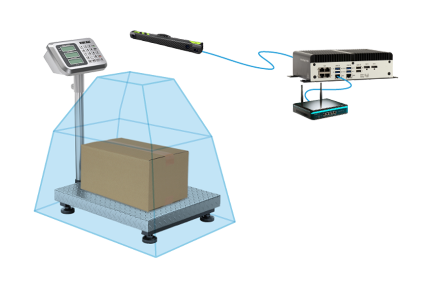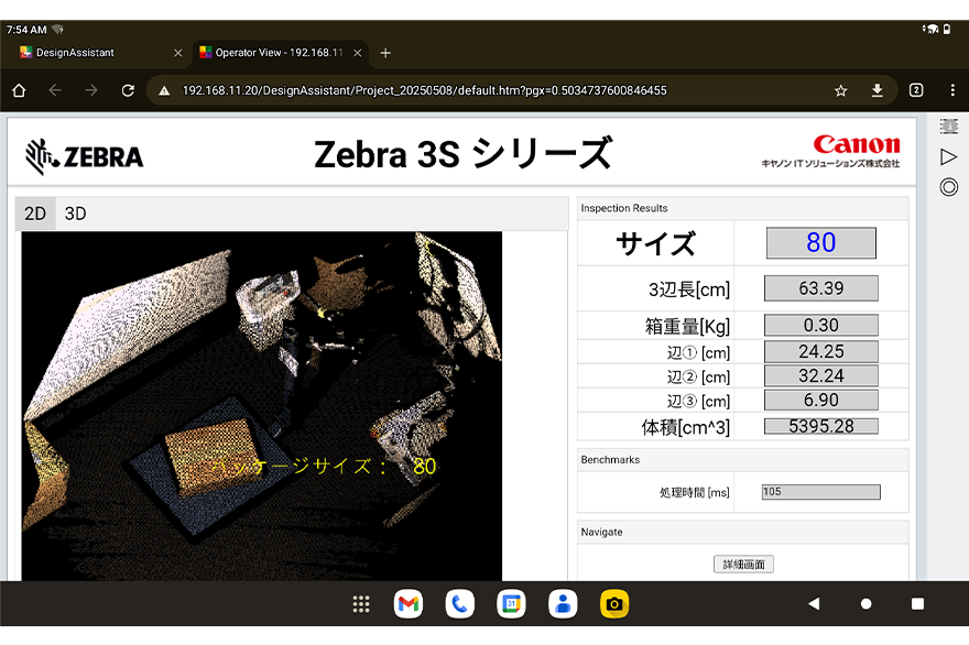段ボールをデジタル秤に載せ、天吊した3Sシリーズ「3S80L」で3辺を瞬時に計測、さらに固定型産業用スキャナ「VS20」で秤の画面に表示された重量を読み取り、タブレットにサイズを表示するデモを行いました。