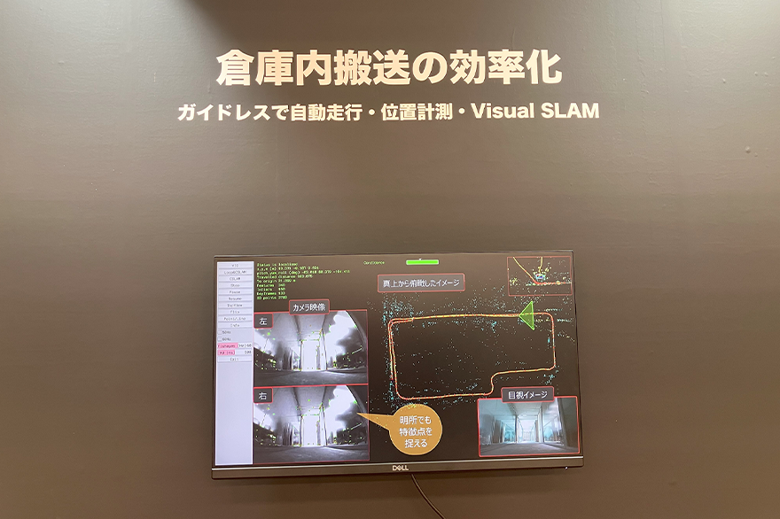 入出庫により風景が目まぐるしく変わり、GPSも使えない倉庫内において、複数台のフォークリフトの位置情報把握可能なシステムとなります。搬送機の自動走行に使われる機械の目であるビジュアルSLAMがどのように自己位置を推定しているのか、実際にシステムを搭載したカートを動かして、位置計測と地図作成の流れを体感いただきました。フォークリフトの自動化や位置情報の推定、地図作成を行いたいとブースを訪れた方に、強い興味を持っていただくことができました。