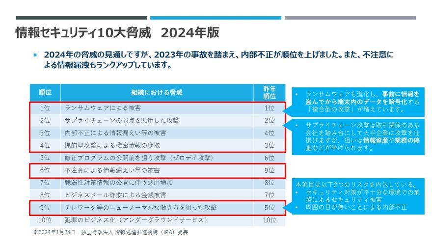 2023年の事故を踏まえ、IPA(情報処理推進機構)が公表する「情報セキュリティ10大脅威 2024年版(組織編)」では、「内部不正による情報漏えい等の被害」が前年の4位から一つ順位を上げて3位になりました。また、「不注意による情報漏えい等の被害」も前年の9位から6位にランクアップしています。