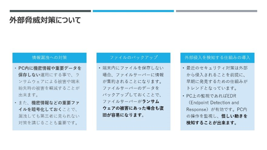 また、外部脅威対策の具体例として、以下の3点を推奨しました。