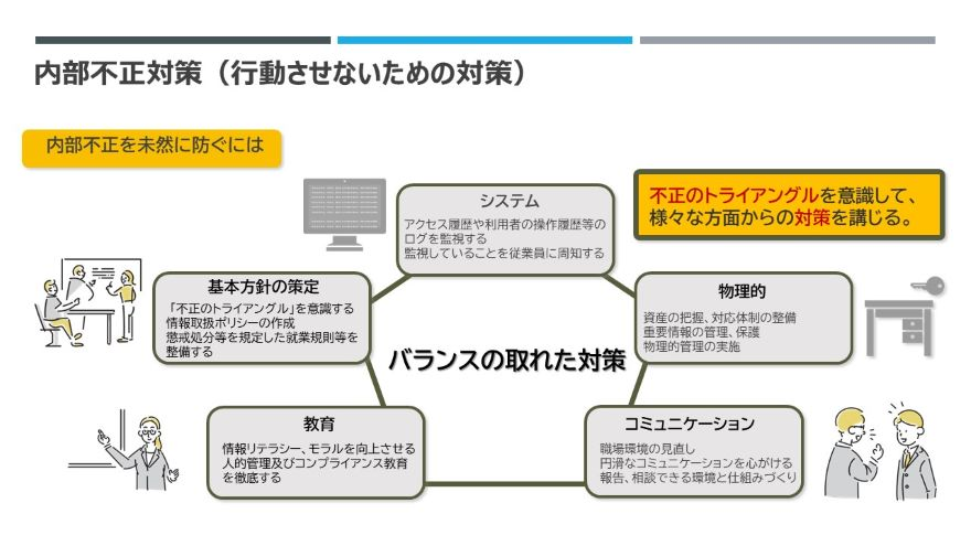 また、「内部不正を未然に防ぐには、不正のトライアングルを意識して、様々な方面からの対策を講じる必要があります」と説明しました。その具体的な取り組みとして「基本方針の策定」「従業員の教育」「円滑なコミュニケーション」「物理的な重要情報の管理・保護」「操作履歴等のログを監視するシステム」などを実施する「バランスの取れた対策」を推奨しました。