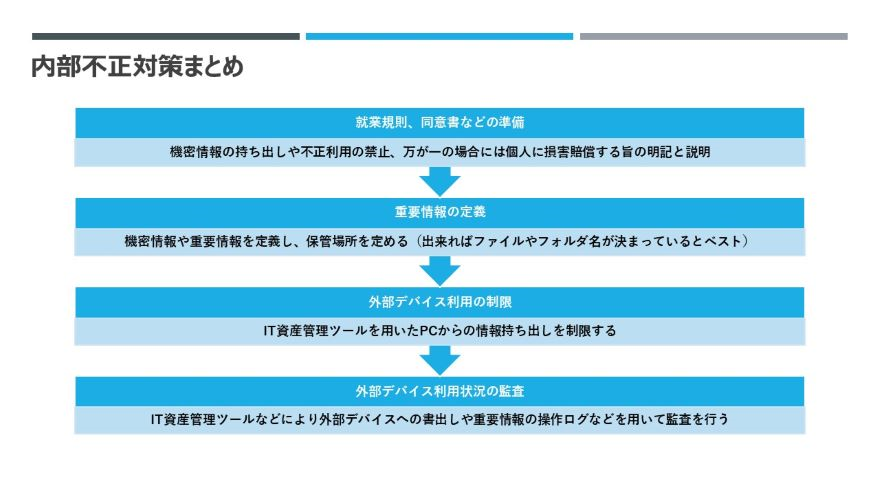 また、行動されてしまった際の対策として、USBメモリなどの外部デバイスを利用できないようにすることに加え、「ログをチェックし、持ち出しが行われた場合でも早期に発見するための仕組み作りが重要です」と説明しました。