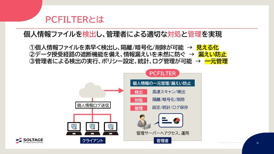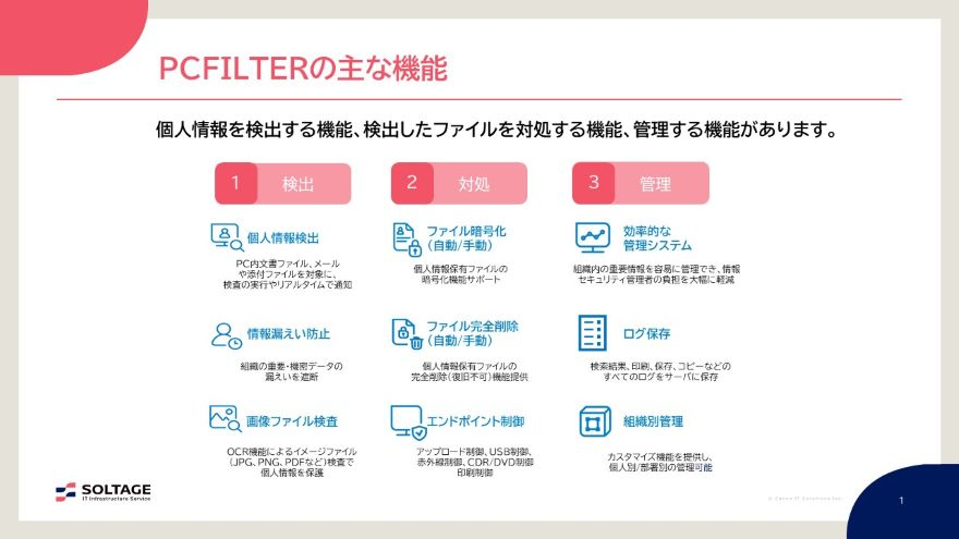 「PCFILTER」の主要機能である「検出」「対処」「管理」について解説していきます。