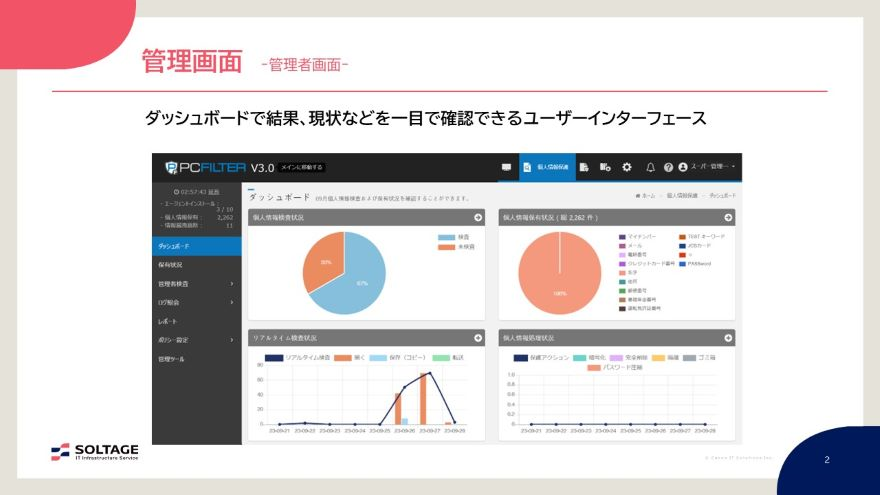 例えば、各クライアントPCにある個人情報について、管理者がクラウド環境の管理画面から各種設定・実行すると、ダッシュボードでの統計やログ管理など可能となります。
