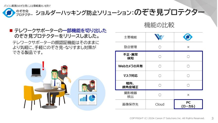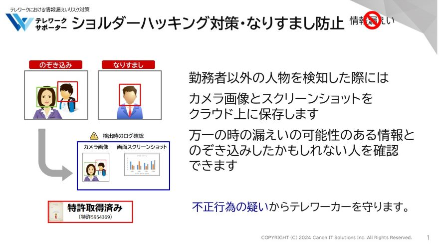 また、キヤノンITソリューションズでは「テレワークサポーター」よりも手軽に、シェアオフィスや喫茶店などでの覗き込み対策に特化したソリューションも提供しています。ショルダーハッキング防止ソリューション「のぞき見プロテクター」は「テレワークサポーター」の一部機能を切り出したツールで、顔認証機能を活用して覗き込みを検知して画面をブラックアウトすることでのぞき見・なりすまし対策ができる製品です。