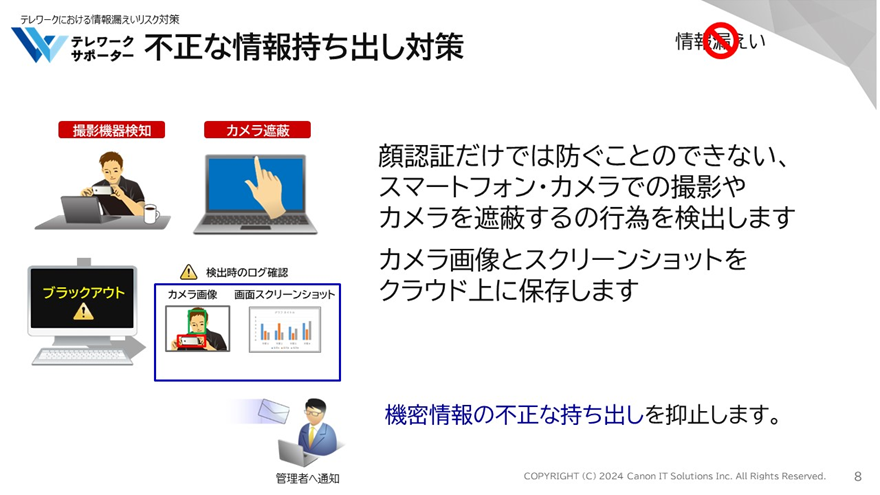 テレワークは今後も多様な働き方の1つとして継続することは間違いありません。日本テレワーク協会の斎数氏が指摘した「セキュリティ対策が不十分な環境での業務によるセキュリティ被害」「周囲の目が無いことによる内部不正」の有効な対策となるのが、キヤノンITソリューションズが提供する情報漏えいリスク対策ソリューション「テレワークサポーター」です。
