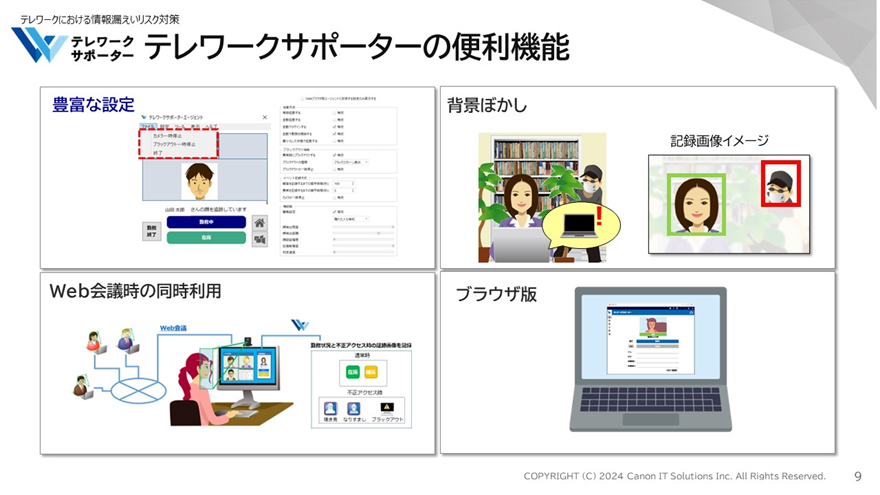 「テレワークサポーター」では、起動時の設定や管理画面上での表示など豊富に設定できます。さらに「背景ぼかし」によるプライバシーに配慮した設定や、Web会議時の他のアプリの同時利用なども可能です。また、「テレワークサポーター」にはWebブラウザで利用できる簡易版も用意しているので、利用環境に応じて様々な使い方が選択できます。