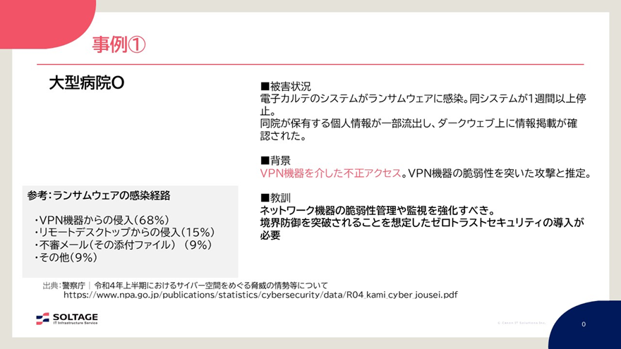 この事例の教訓としては、先述した医療機関と同様、ネットワーク機器の脆弱性管理や監視を強化すること、境界防御を突破されることを想定したゼロトラスト・セキュリティの導入に加え、未知の攻撃への対策を検討することと言えるでしょう。
