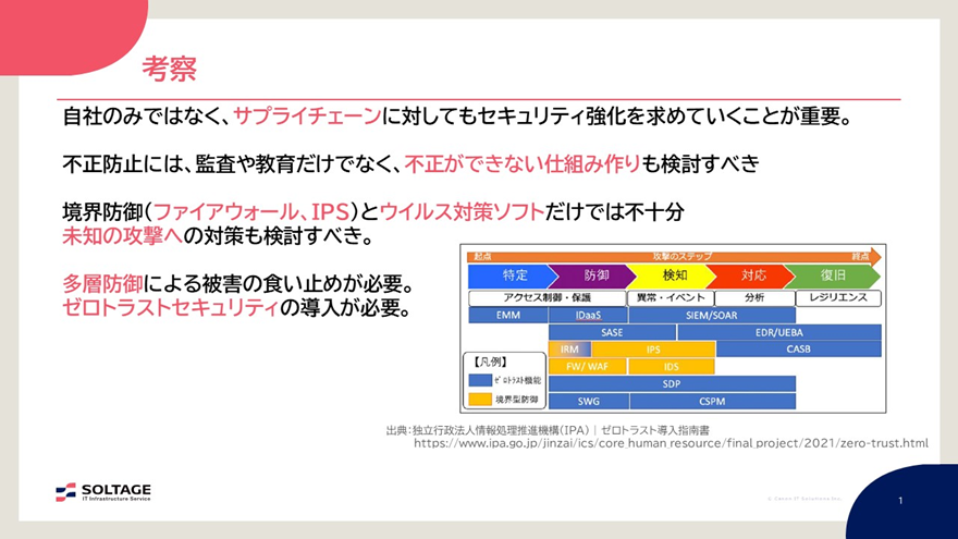 教訓としては「自社のみではなくサプライチェーンに対してもセキュリティ強化を求めていくこと」、また「不正防止には監査や教育だけでなく、不正できない仕組み作りも検討すること」と言えるのではないでしょうか。