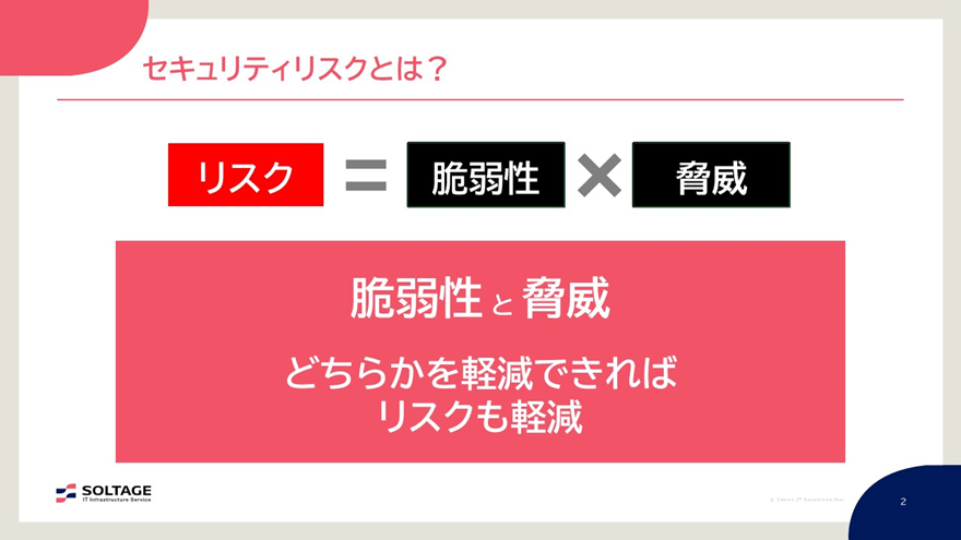 そもそも、セキュリティリスクとは「脆弱性」と「脅威」の掛け合わせと定義されます。どちらかを軽減できればリスクも軽減できますが、一方ということではなくバランスの良いセキュリティ対策が非常に効果的と言われています。