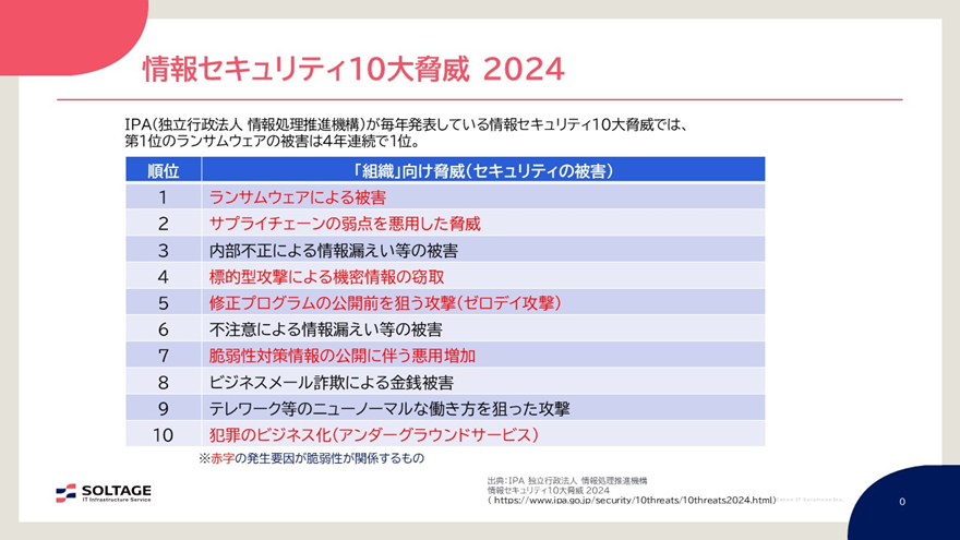 IPA(情報処理推進機構)が毎年発表している「情報セキュリティ10大脅威」では、ランサムウェアの被害は4年連続で1位となり、また、OSやソフトウェアの脆弱性が関連する脅威が、インシデントの発生要因として上位に挙げられました。脆弱性への対処が被害を抑制する有効な手段であることが示されています。