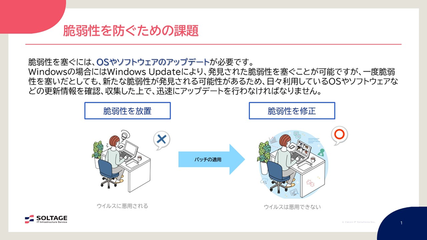 これまで説明してきたように、セキュリティリスクとは脆弱性と脅威の掛け合わせです。脆弱性は「情報が侵害される可能性のある弱点(セキュリティ・ホール)」であり、その対策としては、新たな脆弱性が見つかった場合にメーカーやセキュリティベンダーが提供するパッチを適用することです。