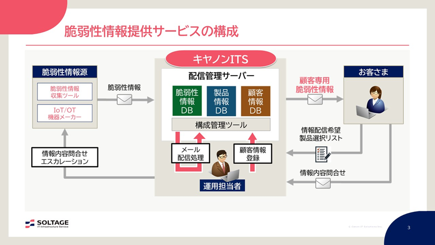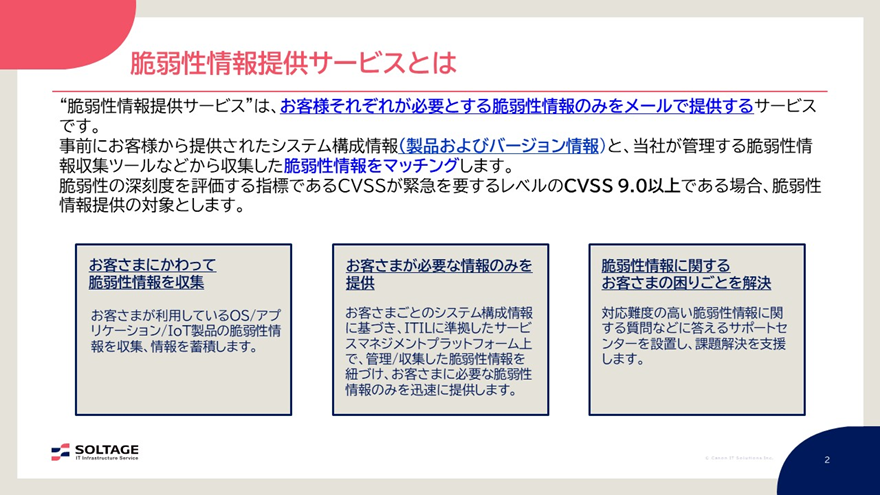 - 事前にお客さまから提供されたシステム構成情報と、キヤノンITSが管理する脆弱性情報収集ツールなどから収集した脆弱性情報をマッチングして、お客さまそれぞれが必要とする脆弱性情報のみを提供するサービスです。