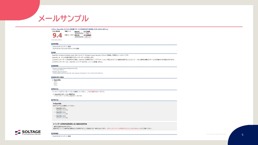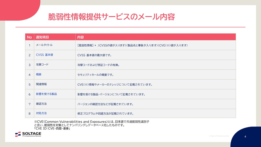 「脆弱性情報提供サービス」では、お客様が判断で迷わないように、緊急を要するレベルとして「CVSS 9.0以上」としています。同サービスのメール内容は、主にCVSS 基本値・概要・影響を受ける製品・修正プログラムや回避方法などの対処方法などです。