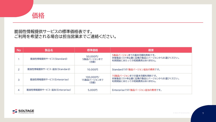 「脆弱性情報提供サービス」の標準価格は、Standard版が5製品バージョンまでの月額利用料が5万円です。また、Enterprise版が15製品バージョンまでの月額利用料が10万円となっています。脆弱性情報の提供回数は原則1日1回までで、脆弱性情報がない場合は提供しません。