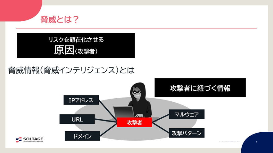 一方、脅威とは「リスクを顕在化させる原因(攻撃者)」と言われています。さらに、脅威情報(脅威インテリジェンス)とは、攻撃者に紐づく情報を指します。具体的には、攻撃者がよく使用するIPアドレスやURL、ドメイン、マルウェアの発信地、攻撃パターンなどが挙げられます。