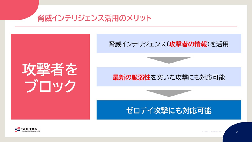 こうした脅威インテリジェンスを活用すると、攻撃者の情報を活用するので、攻撃者をブロックできます。また、攻撃者情報をブラックリストとして登録しているので、最新の脆弱性を突いたゼロデイ攻撃についても対応可能になるというメリットがあります。脅威情報を活用する特徴でもあります。