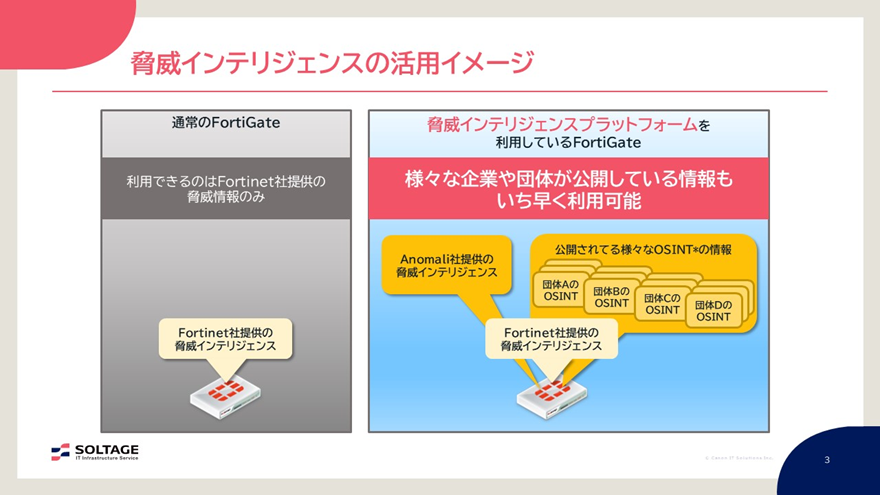 通常、Fortinet社からも脅威インテリジェンスを既に提供されています。その場合は、同社の脅威インテリジェンスのみを使う形になります。対して、「脅威インテリジェンスプラットフォーム」では、脅威インテリジェンスのグローバルリーダーであるAnomali社が提供する脅威インテリジェンスや、オープンソース情報源「OSINT(Open Source Intelligence)」を活用でき、最新の脅威へ対策することが可能です。