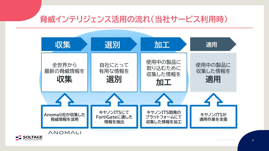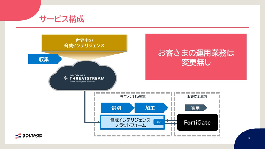 具体的なサービス構成としては、Anomali社の「Anomali Threatstream」で情報を収集し、それを当社の環境にある「脅威インテリジェンスプラットフォーム」に取り込みます。「FortiGate」製品に有効な情報を抽出して加工した上で、お客様の環境からAPI経由で適用することになります。