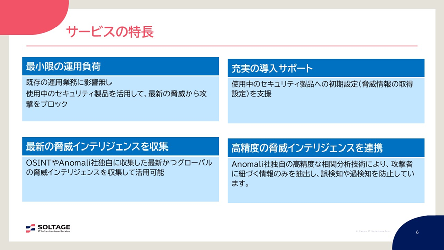 その他の特長としては、使用中のセキュリティ製品への初期設定(脅威情報の取得設定)を支援する「充実した導入サポート」などが挙げられます。