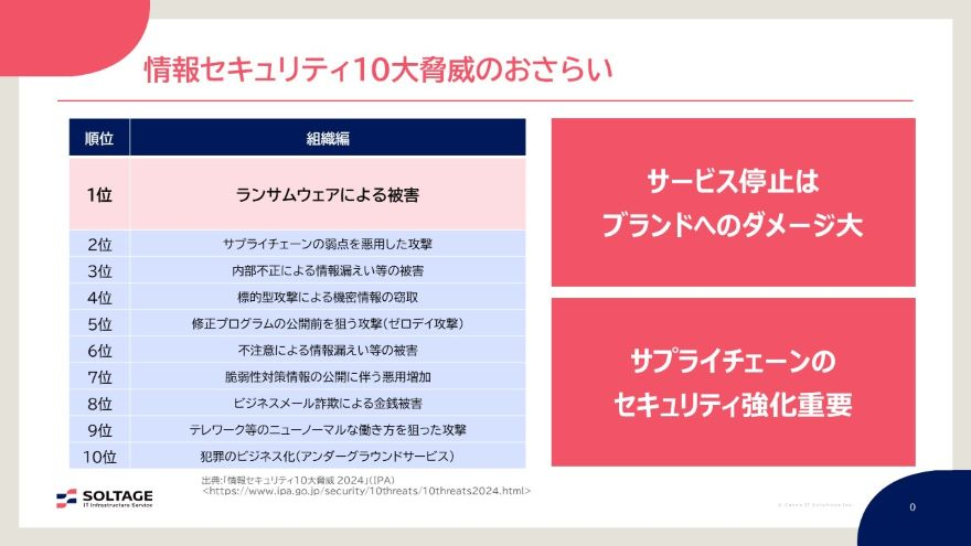 IPAが毎年発表している情報セキュリティ10大脅威(組織編)では、「ランサムウェアの被害」が4年連続で1位となりました。昨今の被害傾向としては、大規模で名前の知れた企業がランサムウェアの被害に遭っているケースが非常に多いと感じています。