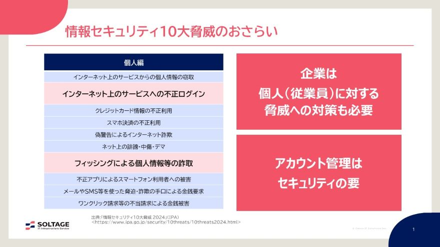 特に「インターネット上のサービスへの不正ログイン」「フィッシングによる個人情報等の詐取」などから重要なアカウント情報が漏れてしまうと、どれだけ高いレベルのセキュリティを施していても事故を防ぐことが難しくなるケースが多いです。そのため、セキュリティの要として「アカウント管理の強化」が重要です。