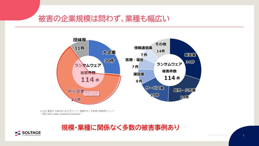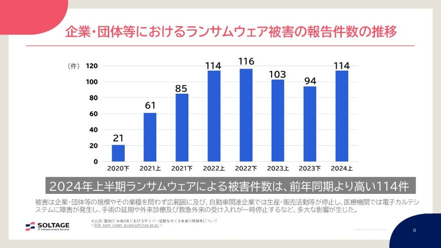 2024年に報告されたランサムウェアの被害を規模別で見ると、被害のあった114件のうち、中小企業が過半数を占めています。医療や製造業などサービスが止まることで影響が大きい組織がニュースで話題になっていましたが、実際は幅広い業種が被害に遭っています。
