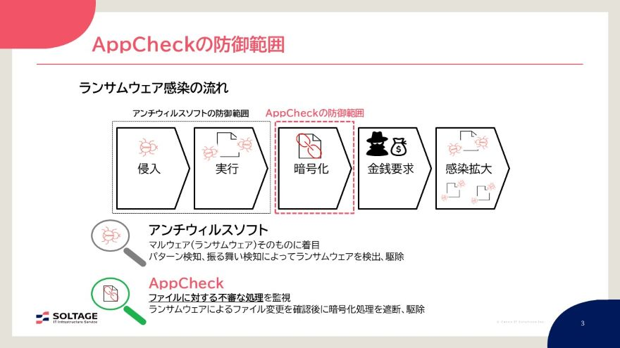ランサムウェア感染の流れを「侵入」「実行」「暗号化」「金銭要求」「感染拡大」の段階で示すと、従来のアンチウイルスソフトでは侵入・実行の段階でパターン検知、振る舞い検知によって検出・駆除します。一方、「AppCheck」ではファイルに対する不審な処理を常時監視します。パターン検知、振る舞い検知によって検出できなかったランサムウェアが実行した暗号化処理を検知・遮断し、不正な暗号化からファイルを守るのがAppCheckです。