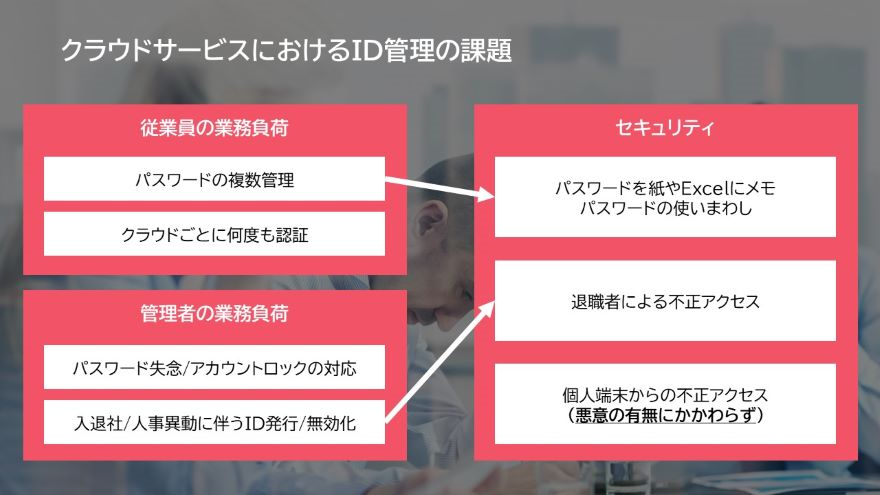 現在、多くの企業でSaaS/クラウドサービスの利用が増加しており、ファイル共有やメール、経費精算、受注管理など様々な業務で活用されています。しかし、サービスごとにログイン認証が必要となり、それらのIDやパスワードの管理が課題となっています。従業員にとっては、パスワードの複数管理やクラウドごとに何度も認証する必要があるなど負担が大きくなっています。