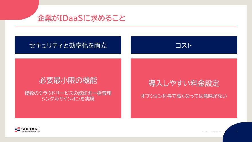 企業がIDaaSに求めることは「セキュリティと効率化を両立する」「コスト」の2点です。セキュリティと効率化を両立に関しては「シングルサインオンさえあれば必要最低限の機能でいい」という声を多く聞きます。コストに関しては「導入しやすい料金設定」が重要であり、低価格をうたうサービスの中にはオプションを付与することで、知らず知らずのうちに高くなっているケースも見受けられます。