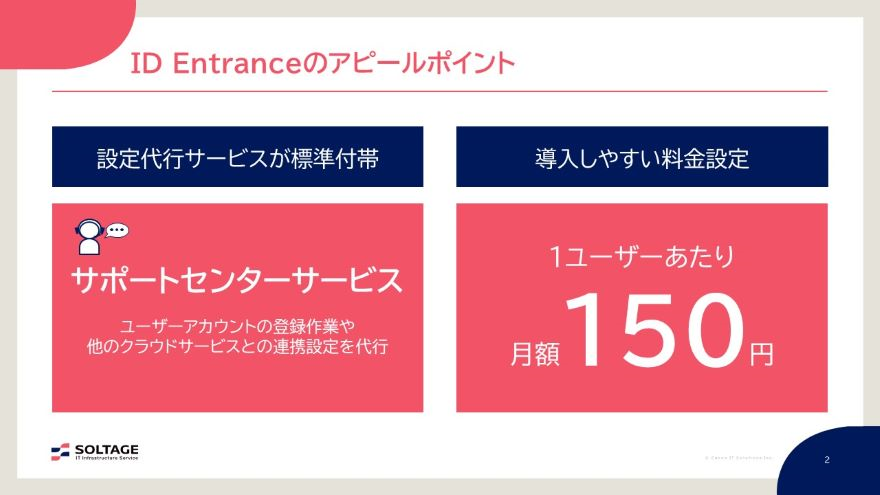 「ID Entrance」のアピールポイントとしては「設定代行サービスが標準付帯している」「導入しやすい料金設定」の2点が挙げられます。