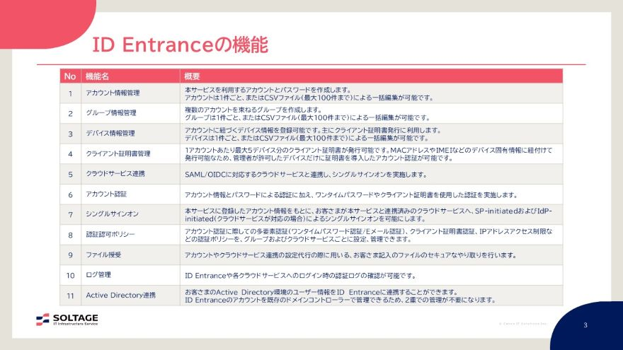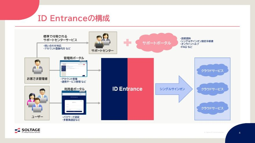 そうした状況を踏まえて、当社のITインフラサービス「SOLTAGE」のサービス群の1つとして、自社開発したID管理サービス「ID Entrance」を提供しています。市場に数あるIDaaSの中で、「ID Entrance」は“導入しやすさ”に自信があり、シンプルで直感的に使いやすいサービスです。
