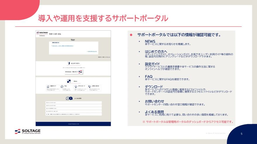さらに管理者の方に向けて、導入や運用を支援するサポートポータルも提供しています。自社で設定される場合の設定ガイドやFAQなど画面キャプチャ付きの各種マニュアル情報を確認できるため、ITリテラシーに関係なく簡単に導入できるサービスです。