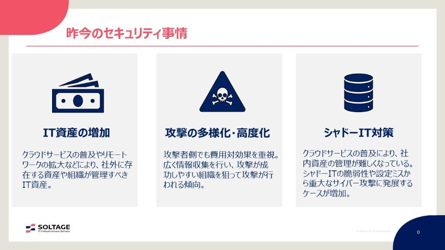 昨今のセキュリティ事情のポイントとしては「IT資産の増加」「攻撃の多様化・高度化」「シャドーIT対策」の3点が挙げられます。