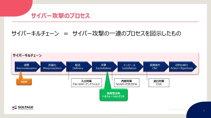 今回、ご紹介する「ASM(アタックサーフェス管理)」は、最初の入口となる偵察プロセスに対応するソリューションです。どのようなIT資産がインターネットにさらされて、どこがリスクになるかを測るのがASMです。