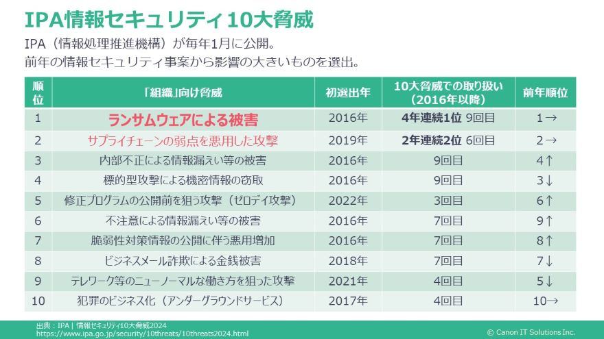 2024年1月にIPA(情報処理推進機構)が公開した「情報セキュリティ10大脅威」によると、組織向けの脅威として「ランサムウェアによる被害」が2021年から2024年まで4年連続で1位となっています。多くのマルウェア感染被害の中で、大きな損害につながりやすいものの一つがランサムウェアです。