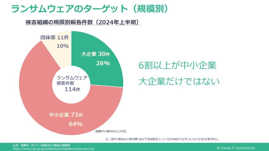 警察庁が公開する「サイバー空間をめぐる脅威の情勢等」のデータによると、2024年上半期の被害組織の規模別報告件数の内訳では、中小企業が64%と過半数を占めているとのことです。大企業の被害事例はニュースでも取り上げられやすいため、大きな組織が狙われているイメージが強いですが、規模を問わずにあらゆる組織で被害に遭遇する可能性があります。