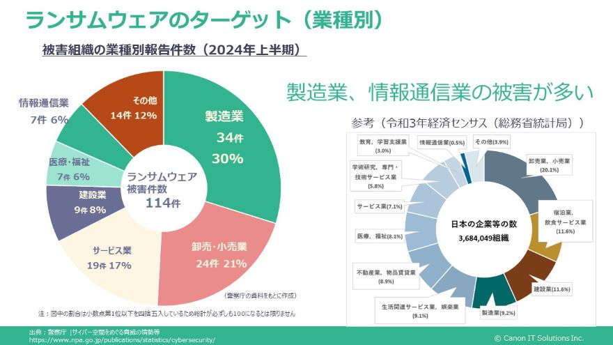 ランサムウェアとは、ファイルの暗号化などを行い、それを復号するための身代金を要求するマルウェアのことです。このようなランサムウェアは、どのような組織をターゲットにしているのでしょうか?