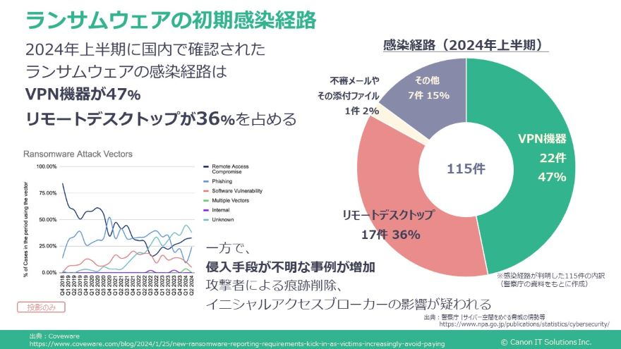また、海外に目を向けると、感染経路が特定できない事例の増加が目立っています。その要因としては、攻撃者が巧妙に痕跡を削除していたり、被害組織へのアクセス手段を提供する「イニシャルアクセスブローカー(IAB)」よって侵入経路がいつ確立されたのかが分からないなどの理由が考えられます。「自組織へのアクセス情報が漏えいしていないか」「退職したユーザーのアカウント情報がそのままになっていないか」などにも注意が必要です。