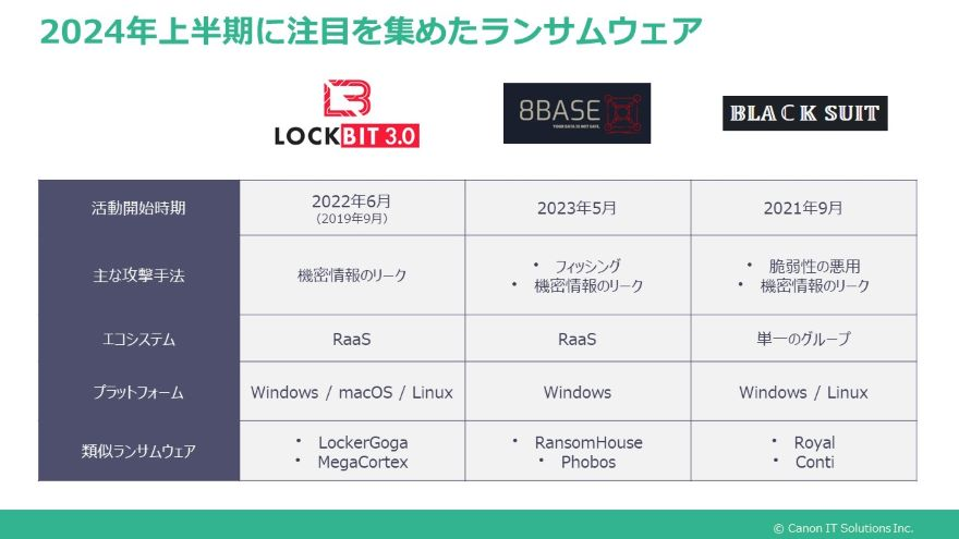 2024年上半期に注目を集めたランサムウェアとしては「LockBit」「8base」「Blacksuit」の3つが挙げられます。いずれも機密情報のリークを伴う攻撃、いわゆる「二重脅迫」を行うことで知られています。また、LockBitと8baseがRaaSであるのに対し、Blacksuitは単一のグループが開発から攻撃までを担っていると言われています。