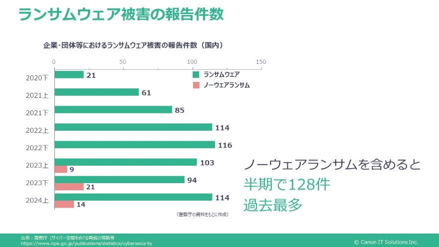 続いて、昨今のセキュリティインシデントの中で、特に重大な被害をもたらしているランサムウェアについて、その最新動向や被害、感染経路、攻撃手法などを説明しました。