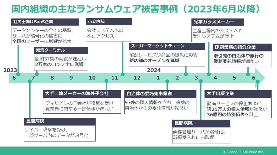 2023年6月以降に確認された国内組織の主なランサムウェアの被害事例を見てみると、製造業や医療機関、公的団体など組織の被害が確認されています。医療機関や自治体では断続的に被害は断続的に発生しています。また、ある私立中学・高校で生徒の成績データが暗号化されてしまい、教師の記憶に基づいて評価せざるを得なくなった事例も発生しています。