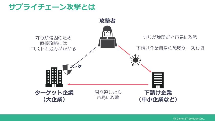 また、ターゲットとする大企業を直接狙って攻撃するのではなく、ターゲット企業と取引関係のある下請け企業などに攻撃を仕掛ける手口が存在します。いわゆる「サプライチェーン攻撃」です。