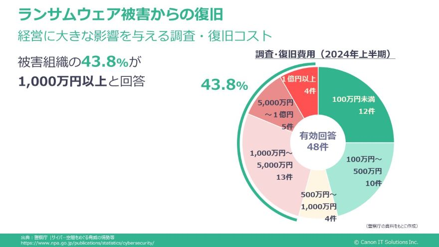 ランサムウェア被害に遭うと、攻撃者による身代金要求だけでなく、ランサムウェアからの復旧にもコストがかかります。国内のランサムウェア被害組織が調査・復旧に要した費用総額の調査では、被害組織の半数近くが調査・復旧に1,000万円以上の費用を要したと回答しています。