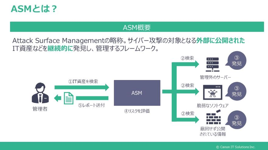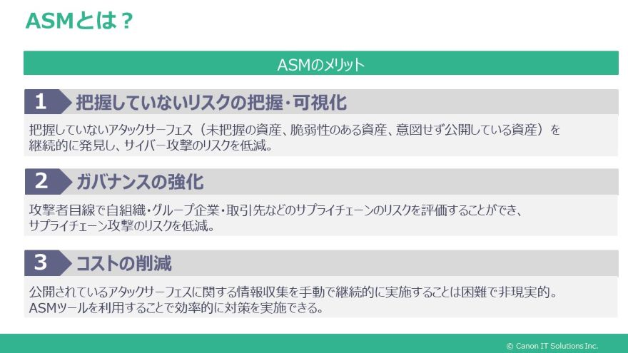 そこでアタックサーフェスを攻撃者よりも早く検知して特定できるソリューションとしてASMを取り上げ、その概要や導入メリットなどを説明しました。また、キヤノンITソリューションズが提供するASMサービスをご紹介しました。