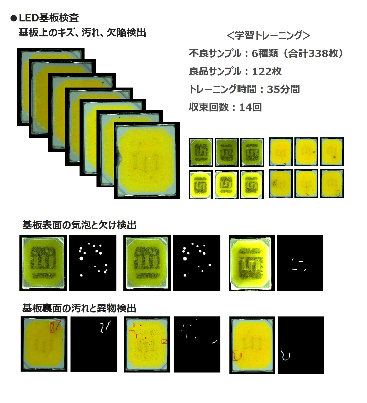 図1のLED基板検査事例では、良品サンプル122枚、不良サンプル(6種類)338枚の画像を用いて、収束回数14回※1、学習時間35分で実施しています。結果画像では、気泡や欠け、汚れの箇所を画素単位で検出していることがわかります。